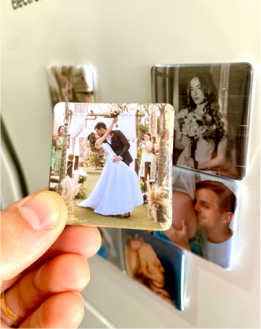 As fotos são colocadas em uma "estrutura" com uma película protetora para maior durabilidade e impedir o desbotamento dos ímãs.